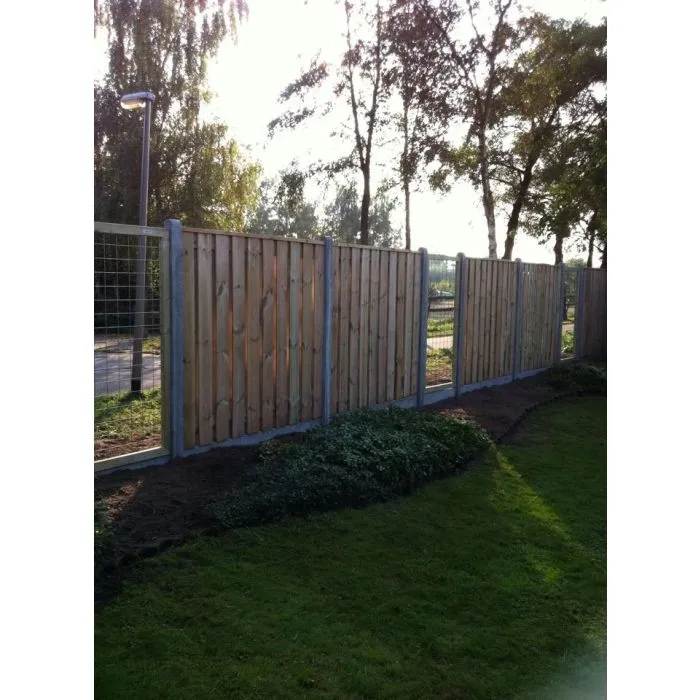 Wooden Fencing pine 19 planks 16x140mm, incl. concrete post and plate. Wood concrete fence 2 meters high 1.90 meters wide. Chrome-free impregnated and waxed pine 21 planks of which 19pl horizontal or vertical, width 14cm, thickness 16mm, stainless steel screwed and FSC certified wood incl. Concrete post, concrete plate and L-brackets. The concrete post and plate are made of reinforced concrete, also pre-drilled. These garden fences are manufactured with FSC wood from responsible forest management and are of high quality.Product attributes